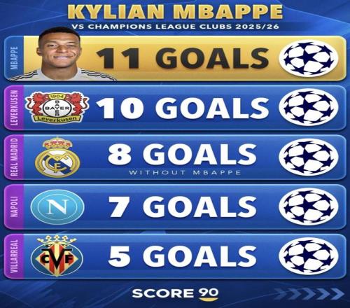 榜单一:姆巴佩对比欧冠球队进球(2025/26)
